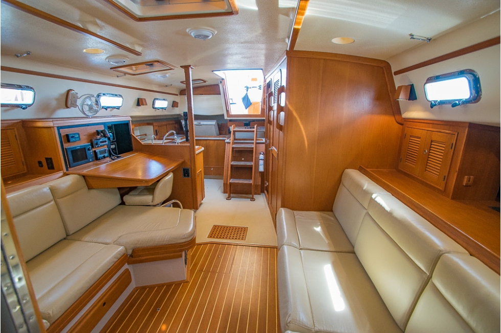 An innovative blend of live aboard comfort and practical cruising features. The forward owner’s suite is a true delight with the entire beam of the yacht utilized for a grand and inviting retreat. The large island berth is offset from the hull providing easy access from both sides. Drawers, cabinets, storage bins and a deep hanging locker provide ample storage Including extra storage under the berth. The main salon featuring Island Packet’s signature bulkhead mounted fold-up table with integral wine & glass storage behind.